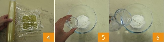 Cubran con film transparente y dejen a temperatura ambiente 4. Mientras tanto, viertan la harina en un bol, desmenucen encima la levadura 5 y viertan el agua a temperatura ambiente 6.
