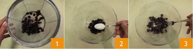 Escurre las cerezas 1, necesitarás 150 g. Enharínalas con 15 g de harina 2 y mezcla 3. Trocea groseramente el chocolate negro y resérvalo.