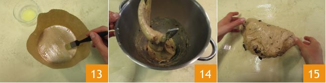 Mientras tanto, engrasa un molde alto para panettone, con capacidad de 750 g. Pasados los 10 minutos, enciende de nuevo la máquina y trabaja la masa durante otros 10 minutos, hasta que esté lisa y adherida al gancho 14. Transfiere la masa a una superficie engrasada y trabaja rápidamente con las manos 15.