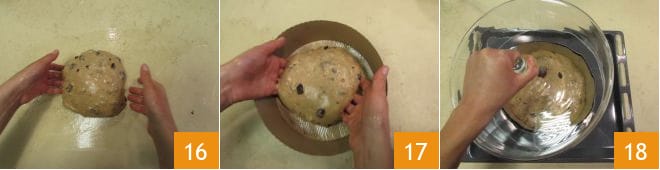 Luego forma una bola, dándole una forma esférica 16 y colócala dentro del molde de panettone 17. Cubre con una campana de vidrio (u otro que no comprometa el crecimiento del panettone). Deja reposar durante 2 horas a temperatura ambiente, luego transfiere al frigorífico y deja madurar durante 15 horas. Transcurrido este tiempo, deja el panettone a temperatura ambiente durante otras 4 horas, siempre bien cubierto. Luego descúbrelo y espera otras dos horas, de este modo se secará ligeramente en la superficie.
