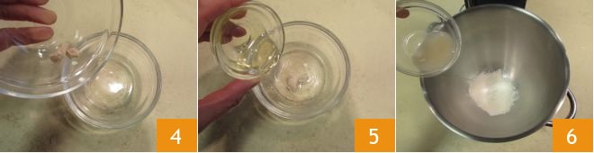 Disuelve la levadura de cerveza en el agua 4, añade la miel 5 y mezcla. Vierte la harina manitoba en el bol de una amasadora y añade la levadura disuelta en agua y miel 6.