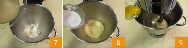 En este punto, añade la primera masa 7, agrega el azúcar 8 y comienza a amasar con el gancho. Cuando tengas una mezcla lisa y homogénea, añade las yemas poco a poco 9. Añade también la sal cuando la masa haya absorbido completamente las yemas.