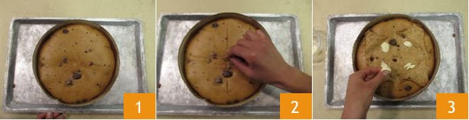 En este punto el panettone habrá crecido y se habrá creado una fina corteza 1; utilizando una cuchilla, crea una cruz 2. Levanta los bordes internos y llévalos hacia el exterior. Añade los trozos de mantequilla dentro de los cortes. Hornea en horno estático precalentado a 185° durante 60 minutos, colocando en la parte alta del horno una bandeja para bloquear el calor directo de la resistencia del horno.