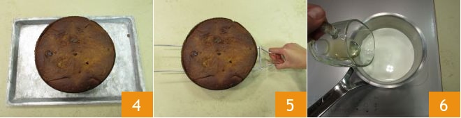Haz la prueba del palillo al final de la cocción o mide la temperatura interna con un termómetro de cocina: deberá estar entre 92-98°. En cuanto el panettone esté cocido, sácalo del horno 4. Pincha utilizando dos largos pinchos 5. Déjalo enfriar al revés durante al menos 5 horas. Utiliza dos cuencos altos o dos cazuelas para que el panettone quede elevado. Cuando hayan pasado unas 3 horas de reposo, prepara la ganache. Trocea el chocolate negro y colócalo en un bol. En un cazo, vierte la nata, añade la miel 6 y caliéntalo hasta casi hervir.