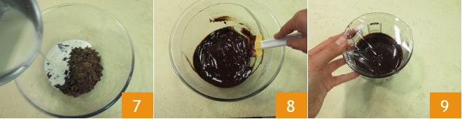 Vierte la nata en el chocolate en dos veces 7, mezclando bien con una espátula hasta que el chocolate esté completamente derretido y tengas una mezcla lisa y brillante 8. Cubre con film transparente y deja reposar en el frigorífico durante 2 horas.