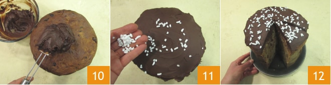En este punto, toma el panettone ya frío, decóralo con la ganache que ya estará fría y densa 10, espolvorea a gusto con granillo de azúcar 11 y sírvelo 12.