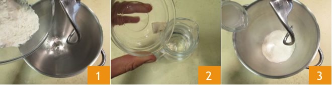 Para preparar el panettone de cerezas y chocolate comienza con la primera masa. Vierte en el bol de una amasadora equipada con gancho la harina manitoba 1. Aparte, disuelve la levadura de cerveza en la cantidad de agua indicada 2, luego vierte en la amasadora 3.