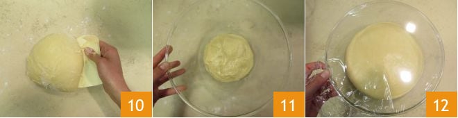 Forma una bola, para obtener una forma esférica 10. Transfiere a un bol 11, cubre con film transparente. Deja fermentar en horno apagado con la luz encendida durante aproximadamente 4-5 horas, colocando en el fondo un cazo con agua caliente. Alternativamente, deja fermentar la masa a temperatura ambiente (26°), lejos de corrientes de aire, hasta que haya duplicado su volumen 12.