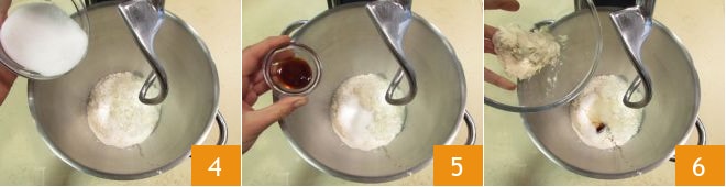 Añade el azúcar 4, el malta 5, y la dosis de fermento madre indicada 6.