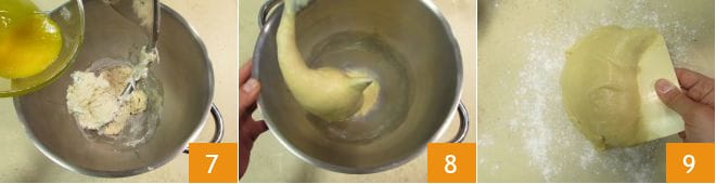 Comienza a amasar, cuando tengas una mezcla homogénea añade las yemas poco a poco 7, hasta completa absorción. Trabaja con el gancho a velocidad media-baja hasta obtener una masa lisa y elástica 8. En este punto, ayudándote con una espátula, transfiere la masa a una superficie ligeramente enharinada 9.