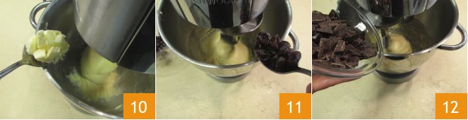 Luego, añade poco a poco la mantequilla a punto de pomada 10. Espera que el primer trozo de mantequilla esté bien absorbido antes de añadir el siguiente. Vierte en la amasadora las cerezas en trozos 11 y el chocolate negro 12. Trabaja durante aproximadamente 5 minutos, luego detén la máquina y espera 10 minutos.