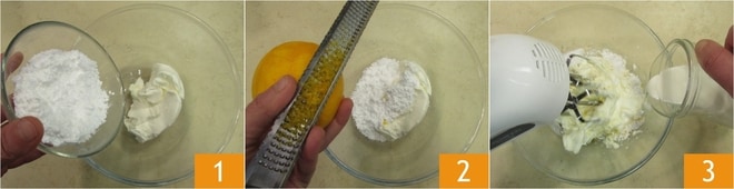 Para realizar el panettone relleno con nata y mascarpone, primero preparad la crema: verted el mascarpone y el azúcar glas en un bol 1, añadid la ralladura de naranja 2 y comenzad a trabajar con las varillas eléctricas. Agregad la nata mientras mantenéis las varillas en acción 3.