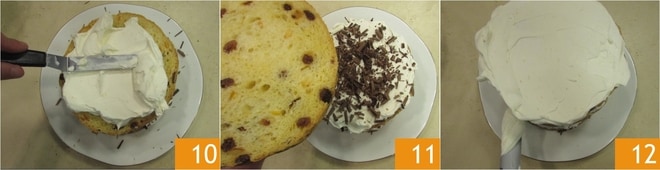 Untad otra capa de crema 10 y añadid más virutas de chocolate, luego cubrid con la tercera rodaja de panettone 11. En este punto, distribuid la crema restante sobre toda la superficie del panettone 12.