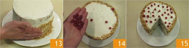 Decorad los lados con el granulado de avellanas, llegando hasta el borde superior 13. Finalmente, adornad con las grosellas 14 y algunas hojitas de tomillo. ¡Vuestro panettone relleno con nata y mascarpone está listo para ser servido 15!