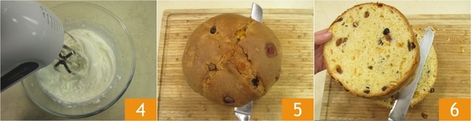Debéis obtener una crema suave y homogénea 4. Tomad el panettone y retirad la tapa superior 5, luego cortadlo horizontalmente en 3 rodajas del mismo grosor 6.