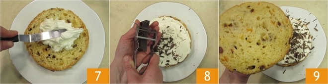 Colocad la primera rodaja en un plato de presentación y untad una capa de crema con una espátula 7, luego añadid virutas de chocolate obtenidas con un pelapapas 8. Colocad la segunda rodaja de panettone 9.