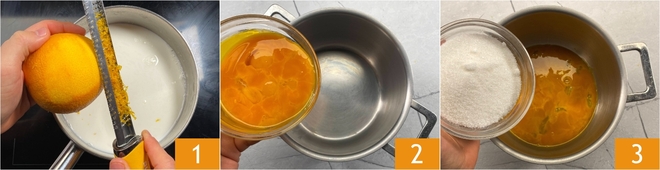 Para preparar el panettone relleno, comenzad con la crema pastelera: verted la leche en un cazo, añadid la ralladura de naranja 1 y calentad hasta que esté a punto de hervir. Mientras tanto, poned las yemas 2 y el azúcar en otro cazo 3.