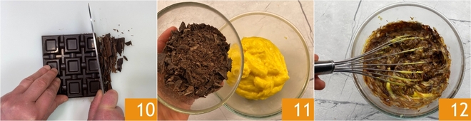 Ahora picad el chocolate negro con un cuchillo 10 y añadidlo a la crema en el bol más pequeño 11. Mezclad con el batidor hasta que se disuelva por completo 12, luego cubrid ambas cremas con papel film en contacto y dejad enfriar en el frigorífico. Una vez frías, retomad las cremas y ablandadlas con el batidor, luego transferidlas a 2 mangas pasteleras sin boquilla.