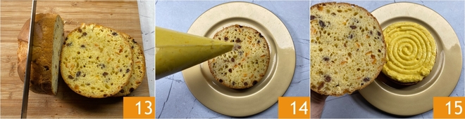 En este punto, cortad el panettone horizontalmente en 4 rebanadas del mismo grosor 13. Colocad la primera rebanada en el plato de servir, luego rellenad con la crema clara 14 y cubrid con la segunda rebanada de panettone 15.