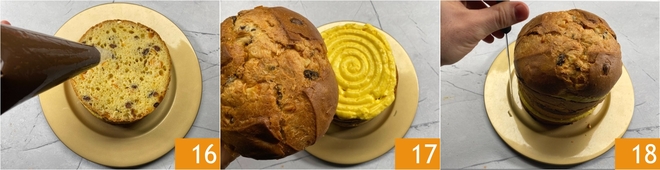Rellenad con la crema de chocolate 16, luego continuad agregando la tercera rebanada de panettone y otra capa de crema clara. Finalmente, cubrid con la tapa 17. Nivelad la crema pasando la hoja del cuchillo (o una espátula) por los lados 18.