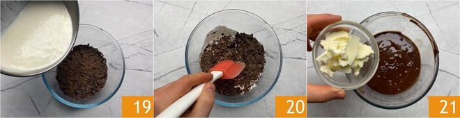 Ahora ocupémonos del glaseado: calentad la nata en un cazo y colocad el chocolate negro picado en un bol. Cuando la nata haya hervido, vertedla sobre el chocolate en 3 veces 19, mezclando suavemente con una espátula para no incorporar aire 20. Una vez que el chocolate se haya disuelto, agregad la mantequilla fría en cubos, poco a poco 21.
