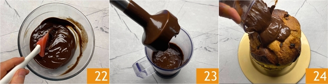 Mezclad de nuevo hasta que la mantequilla se disuelva por completo 22, luego transferid la mezcla a un vaso y emulsionad con una batidora de mano durante un par de minutos 23. En este punto, verted el glaseado obtenido sobre la tapa del panettone relleno 24 y dejad que gotee por los lados.