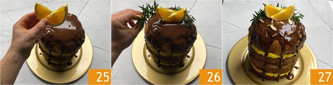 Dejad cristalizar el glaseado durante unos minutos, luego decorad con las rodajas de naranja (podéis ayudaros con un palillo para mantenerlas juntas) 25, el mirto 26 y las almendras laminadas. Guardad en el frigorífico durante 10 minutos antes de servir vuestro panettone relleno 27.
