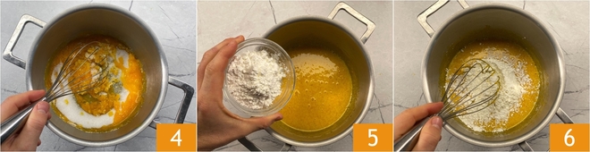 Mezclad bien con un batidor 4, luego agregad la maicena 5 y mezclad de nuevo 6.