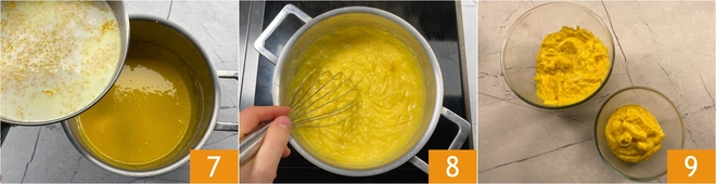 Agregad la leche caliente en 2 veces 7, luego moved al fuego y dejad espesar a fuego lento, mezclando continuamente 8. Cuando hayáis alcanzado la consistencia deseada, apagad el fuego y verted dos tercios de la crema en un bol y un tercio en otro 9.