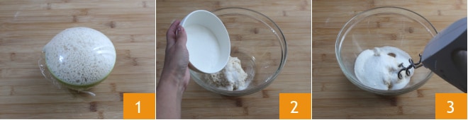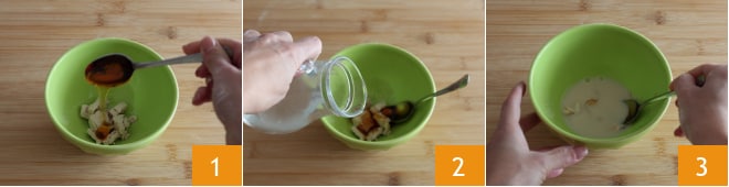 Para preparar el panettone sin gluten, empieza por el fermento: en un bol desmenuza la levadura fresca, añade el malta de arroz 1 y la mitad de la dosis de agua tibia 2. Luego mezcla con una cuchara 3