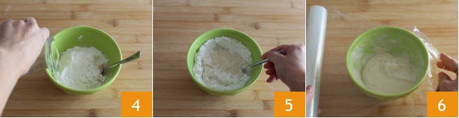y tan pronto como la levadura se haya disuelto, añade la harina y el resto del agua tibia 4. Mezcla 5 hasta que se absorba completamente para obtener una masa lisa y sin grumos. Cubre con film 6 y deja fermentar durante una hora a una temperatura de aproximadamente 26°.