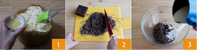 Después de 2 horas, recupera el molde que habrá llegado al borde del molde, quita el film y pincela con mantequilla derretida tibia 1. Cocina en horno ventilado precalentado a 180°: los primeros 15 minutos colócalo en la rejilla más baja del horno. Luego abre rápidamente el horno el tiempo de cubrir con una hoja de aluminio; continúa la cocción por otros 35 minutos. Controla de vez en cuando (sin abrir más el horno) y antes de sacarlo, haz la prueba del palillo para verificar que esté cocido. Apaga el horno y espera 10 minutos antes de sacarlo. Luego sácalo del horno y deja enfriar sobre una rejilla. Mientras tanto, prepara la cobertura: en un cazo vierte la nata y llévala a rozar el hervor. Tritura el chocolate negro 2, colócalo en un bol pequeño y vierte la nata caliente 3.