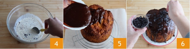 Mezcla rápidamente hasta que el chocolate esté completamente derretido 4. Vierte la mezcla sobre la superficie del panettone distribuyéndola delicadamente con la espátula 5 y dejándola caer también por los bordes. Espolvorea con el chocolate negro en escamas 6 y sirve tu panettone sin gluten.