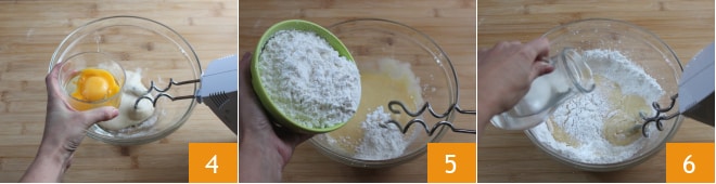Luego agrega las yemas 4 y continúa mezclando con las varillas a velocidad media. Tan pronto como las yemas estén integradas, añade poco a poco la harina y el agua tibia 5 6. Trabaja todo al menos 15 minutos.