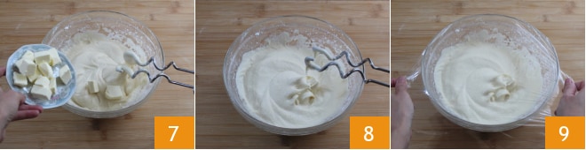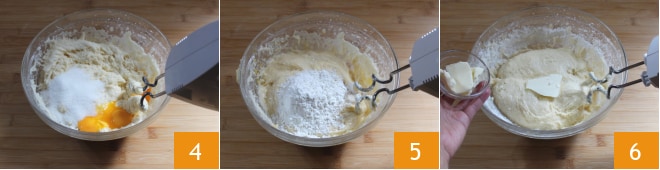 continuando amasando 4. Añade también 50 g de harina 5 y trabaja siempre con las varillas eléctricas hasta que se absorba completamente. Finalmente, añade 20 g de mantequilla en trozos, siempre poco a poco 6.