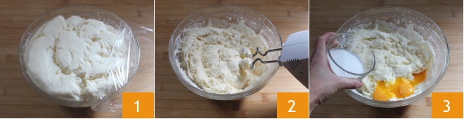 Recupera la masa 1 y trabaja con las varillas a baja velocidad para desinflarla 2. Luego añade 40 g de azúcar y las yemas 3.