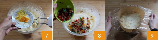 Una vez absorbido, aromatiza con cáscara de limón y naranja 7 y, después de 5 minutos, añade los frutos confitados 8, continuando amasando por al menos 10 minutos. Distribuye uniformemente la masa en el molde de panettone de 750 g, cubre con film 9 y deja fermentar en el horno apagado con la luz encendida por al menos 2 horas: la masa deberá llegar al borde del molde.