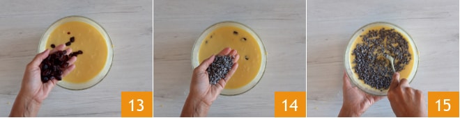 Añade los arándanos secos 13 y las gotas de chocolate congeladas 14. Mezcla bien 15,