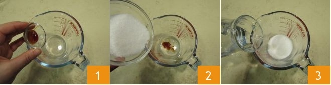 Para preparar el panettone, comienza con la primera masa. Vierte en un bol la malta 1, los 65 g de azúcar granulada 2 y los 125 g de agua a temperatura ambiente 3.