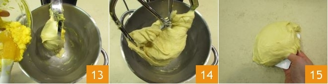 Para favorecer la absorción, utiliza una espátula para despegar la masa que haya quedado adherida a la hoja y activa nuevamente la batidora a velocidad media. Cuando la masa esté bien seca y la mantequilla se haya absorbido completamente, añade la parte restante de la emulsión de mantequilla y yemas 13. Trabaja hasta obtener una masa lisa y homogénea 14, luego transfiérela a una superficie de trabajo, ayudándote con una rasqueta 15.