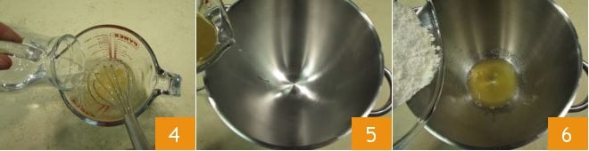 Mezcla con un batidor hasta disolver el azúcar 4; luego vierte el jarabe en una batidora equipada con una pala de hoja 5. Añade los 250 g de harina de manitoba de una vez 6 y comienza a amasar.