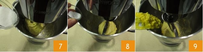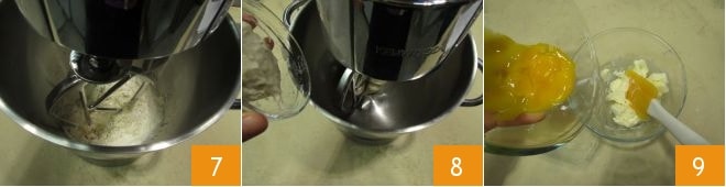 Añade luego las restantes 10 y mezcla nuevamente para obtener una emulsión homogénea 11. En este punto, añade la mitad a la batidora en funcionamiento 12.