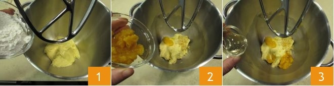 Para la segunda masa del panettone, usando una rasqueta, despega la primera masa (levada) del bol de vidrio y transfiérela a la batidora, siempre equipada con hoja. Añade 65 g de harina de manitoba 1 y activa la máquina a velocidad moderada hasta que se haya absorbido completamente. Luego añade las masas aromáticas, es decir, la pasta de naranja, la de mandarinas y la de limón 2; añade luego la miel 3