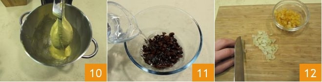 y termina de trabajar la masa, hasta que esté bien unida 10. Mientras tanto, pon a remojar las pasas 11 y corta en cubitos tanto el cedro como la naranja confitada 12.