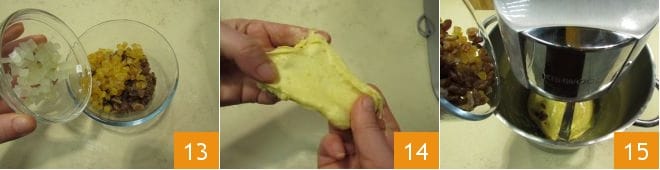 En este punto, escurre bien las pasas y colócalas en un bol, añade también naranja y cedro y mezcla 13. Para asegurarte de que la masa esté lista, apaga la máquina, toma una porción y si al estirarla con las manos resulta delgada pero no se rompe fácilmente, significa que ha alcanzado la elasticidad adecuada 14; si no es así, trabaja la masa unos minutos más, de lo contrario, añade la mezcla de frutas confitadas y pasas en la batidora 15 y actívala nuevamente a velocidad moderada.