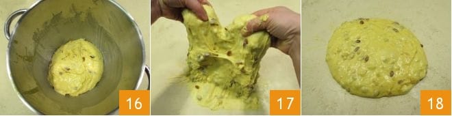 Cuando la mezcla de frutas confitadas y pasas esté bien incorporada, apaga la máquina, despega la hoja y deja reposar la masa durante unos 20 minutos dentro del bol de la batidora 16, cubriéndola con un paño de cocina. Luego transfiérela a una superficie, dale algunos pliegues 17 y deja reposar durante otros 30 minutos a temperatura ambiente 18; no necesitarás cubrirla. No te preocupes si la masa resulta un poco pegajosa, ayúdate a trabajarla utilizando una rasqueta.