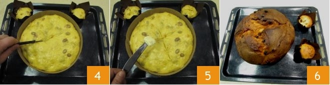 Una vez levado, déjalo descubierto a temperatura ambiente durante unos 30 minutos, de esta manera se formará en la superficie una fina película. Con un cortador, haz una incisión en forma de cruz 4 y pon una nuez de mantequilla en el centro de la cruz 5. Hornea a 175° en modo estático durante 50 minutos, después de 20-25 minutos saca los panettones pequeños y continúa la cocción del panettone por los minutos restantes. Luego sácalo del horno
