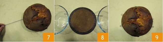 e insértale 2 palillos de acero en los dos bordes exteriores 7. Déjalo enfriar boca abajo durante toda la noche, utilizando dos ollas o dos boles de la misma altura para fijarlo 8. A la mañana siguiente, gíralo, retira los palillos y tu panettone estará listo para disfrutar 9!