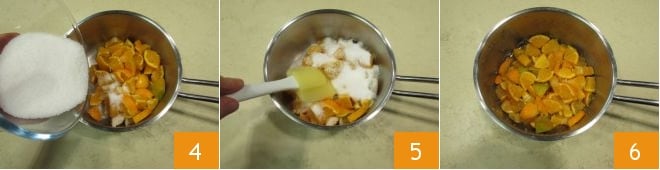 Transfiérelas a una cacerola y añade el azúcar 4, mezcla 5 y deja madurar durante unos 15-20 minutos hasta que el azúcar se haya disuelto 6.
