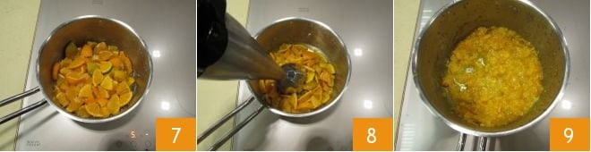 En este punto, pon a fuego y cocina a fuego lento durante 35-40 minutos 7. Una vez cocidas, deja que se templen y tritura todo con una batidora de mano 8 hasta obtener tu pasta de mandarinas 9.